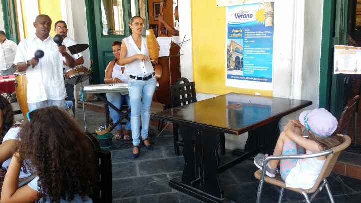 Música cubana por doquier. Mi pequeña fan, sentada en primera fila, casi se va a bailar con el grupo.