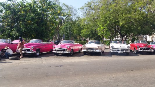 Coleccion de carros antiguos frente al Capitolio, esperando por ser alquilados.