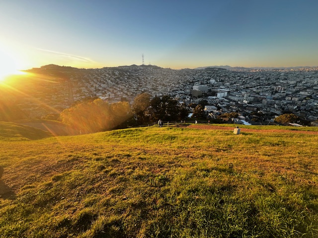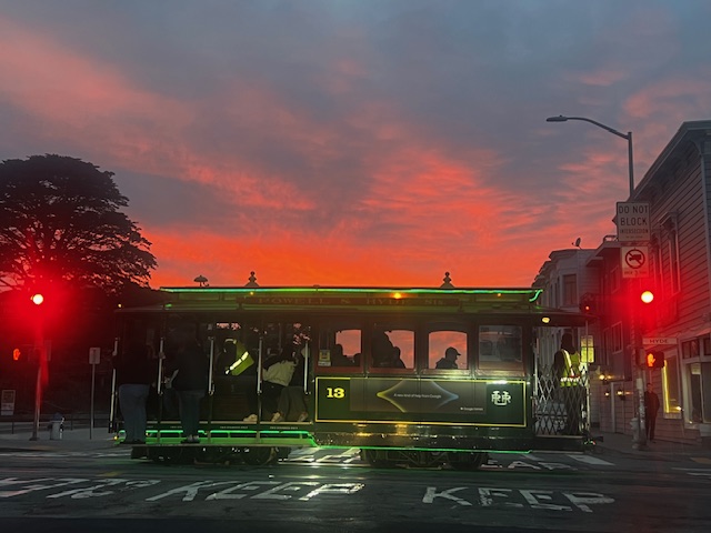 No es la primera vez que nos pasa. San Francisco es la ciudad en la que apenas sales a caminar y lo inesperado acontece. Y no me refiero a eventos transformadores que cambian vidas pero si a esos que te cambian la visión de la vida si estás prestando atención y logras apreciarlos. Ciudad de matices. Ciudad de sutilezas. Una ciudad estructura de piedras que alguien dejó a la orilla de la playa. Música en vivo en una heladería que no acaba de abrir sus puertas. Murales en las paredes de unas casas que terminan una calle diminuta y empinada donde nada parece real. Y los atardeceres. Los atardeceres maravillosos que se te vienen encima mientras aguardas en un semáforo a que un tranvía cargado de turistas cruce la avenida.